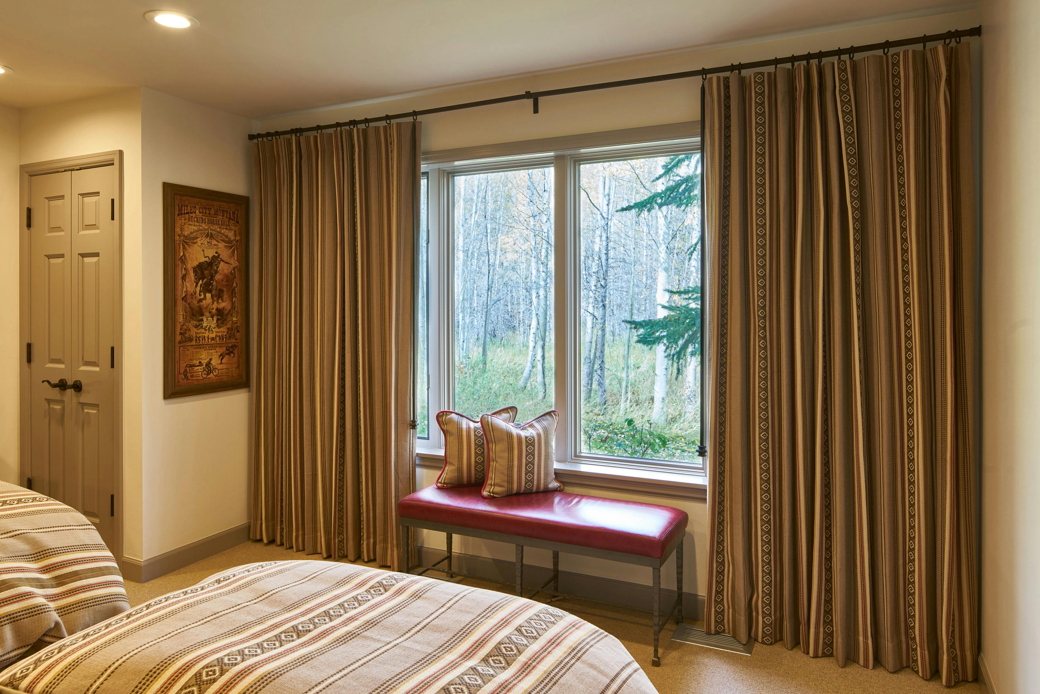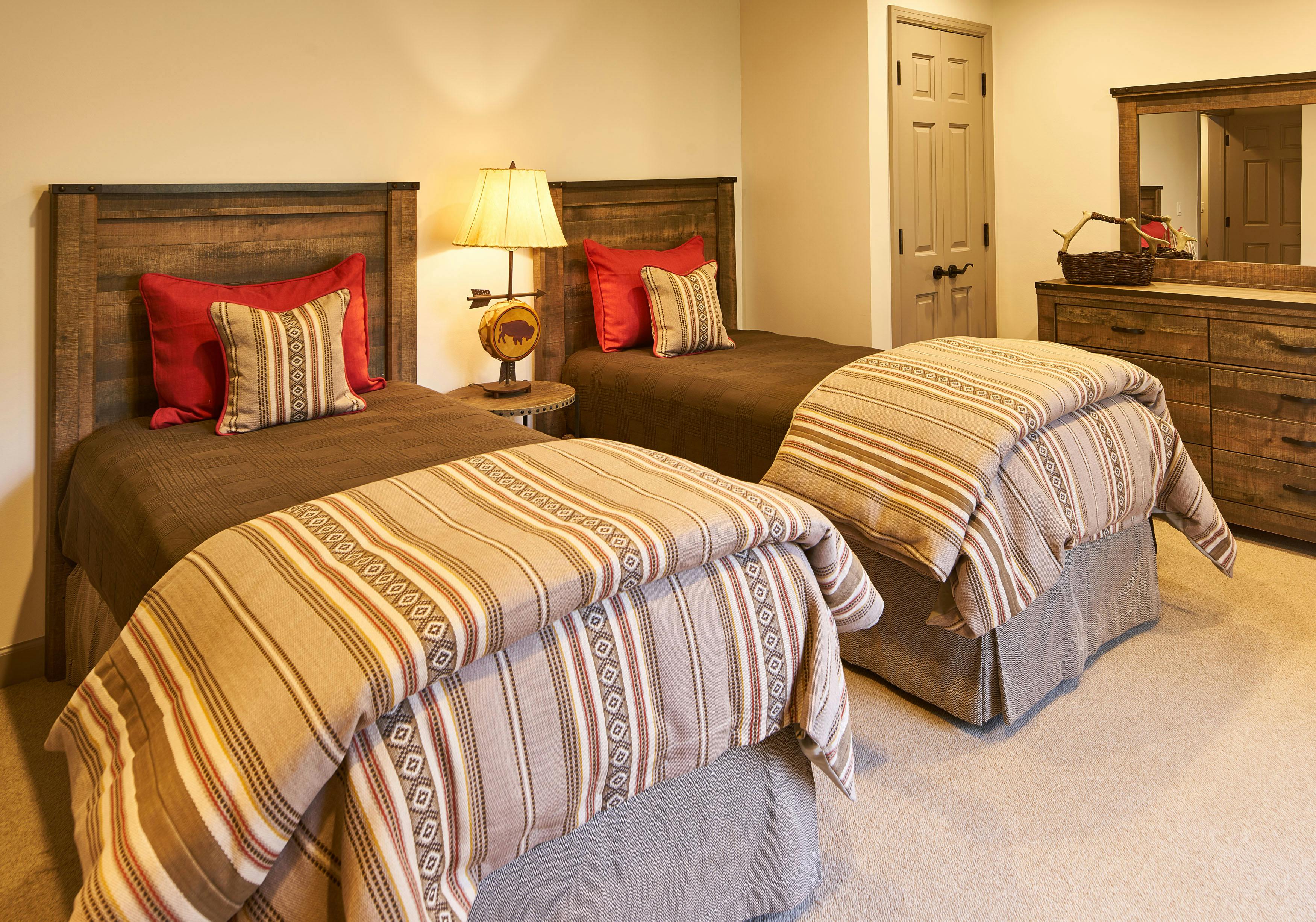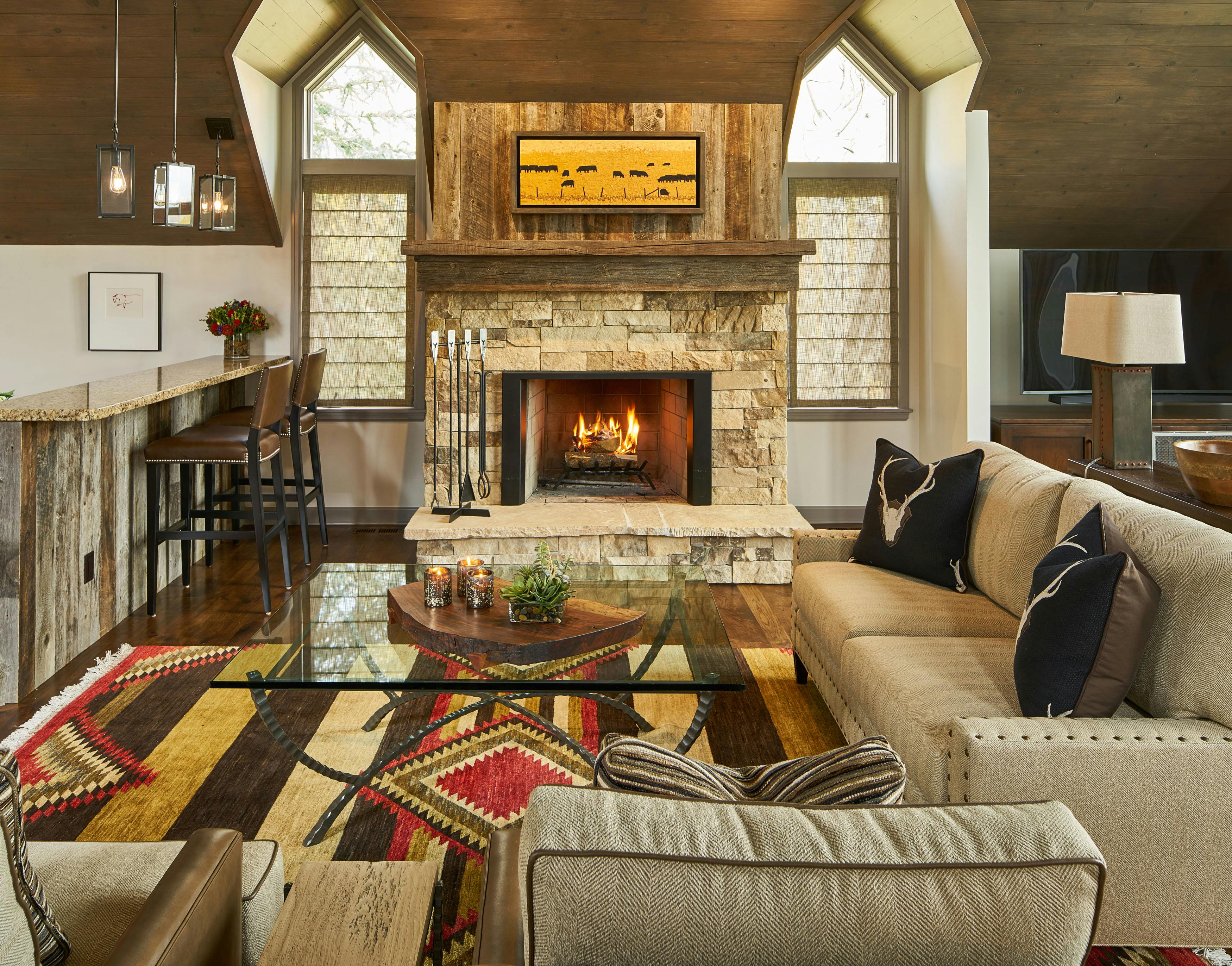 This 4,500 square ft. Teton Pines Cluster Unit was completely remodeled to give this dated residence a completely new transitional mountain feel. The unsightly yellow pine wood was stained either gray or chestnut brown and combined with a crisp fresh paint job made the entire space feel lighter and more open. The custom built-ins, new fireplace, new stair railing, and updated bathrooms helped to redefine the entire residence. The carefully selected furnishings are brought together with the space-defining contemporary western-inspired wool rugs that were sourced from a local rug gallery.