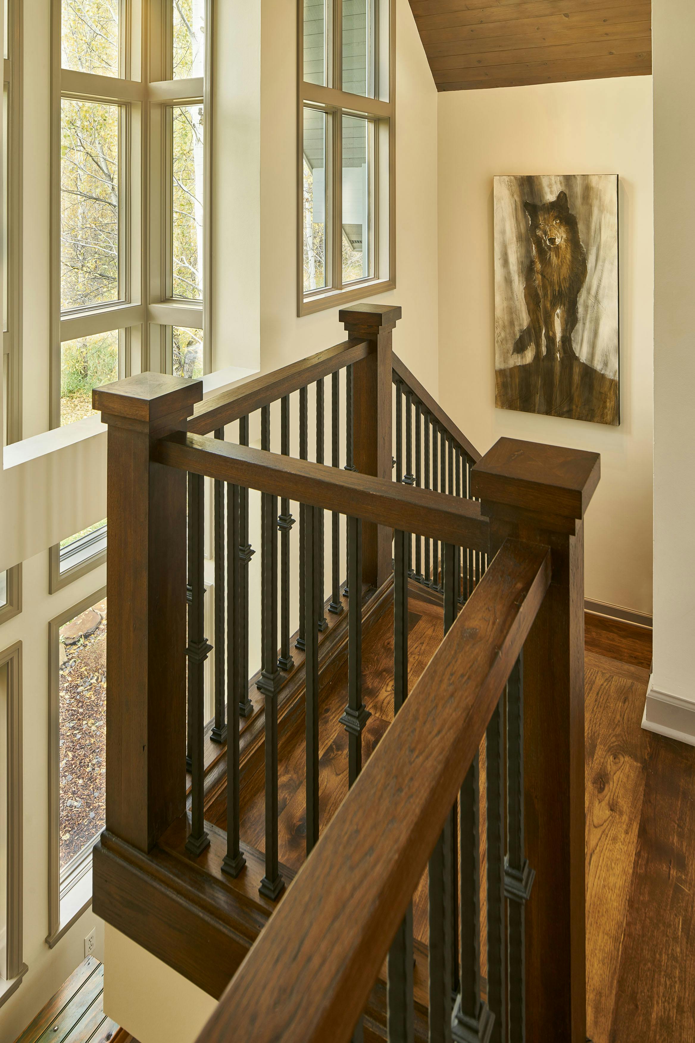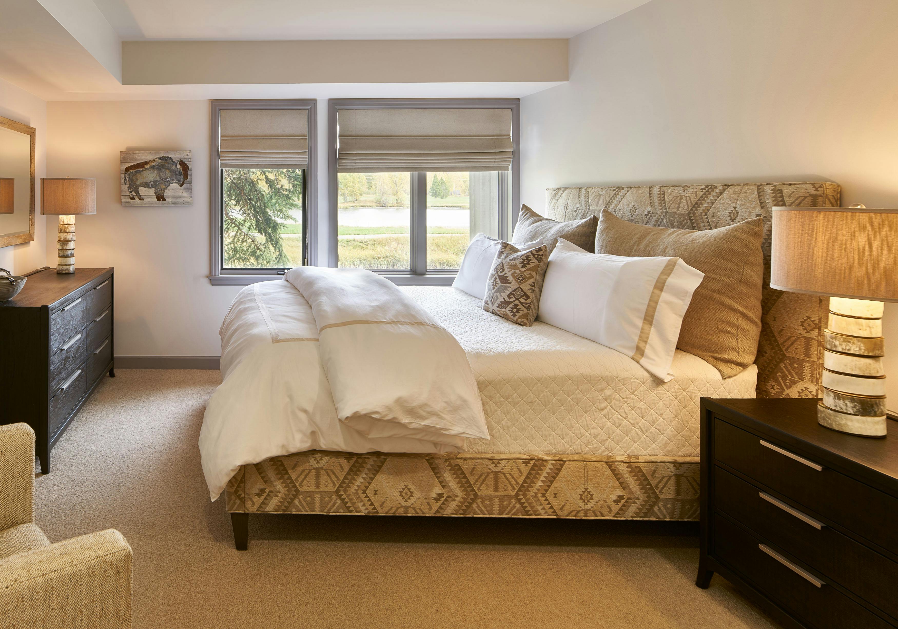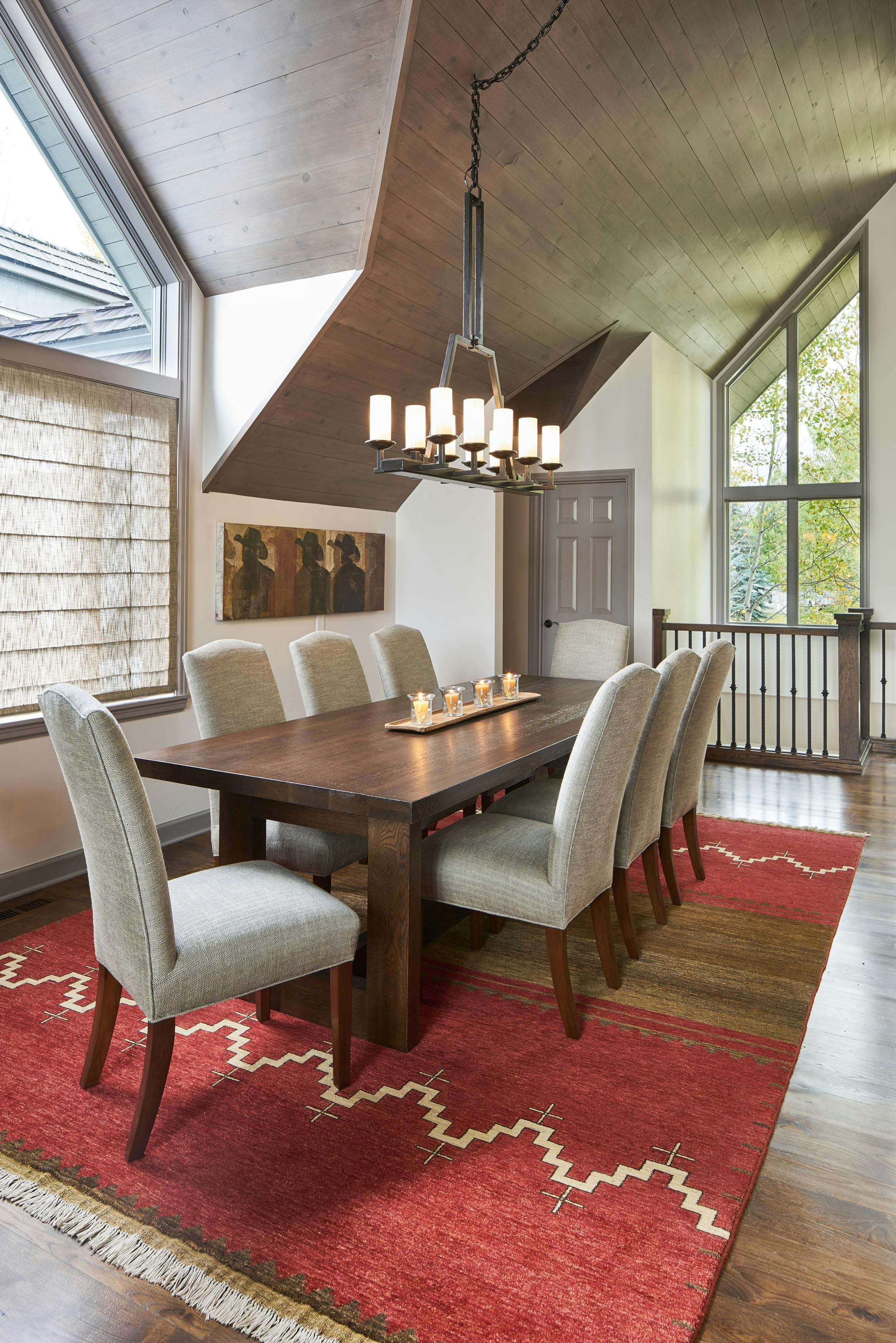 This 4,500 square ft. Teton Pines Cluster Unit was completely remodeled to give this dated residence a completely new transitional mountain feel. The unsightly yellow pine wood was stained either gray or chestnut brown and combined with a crisp fresh paint job made the entire space feel lighter and more open. The custom built-ins, new fireplace, new stair railing, and updated bathrooms helped to redefine the entire residence. The carefully selected furnishings are brought together with the space-defining contemporary western-inspired wool rugs that were sourced from a local rug gallery.