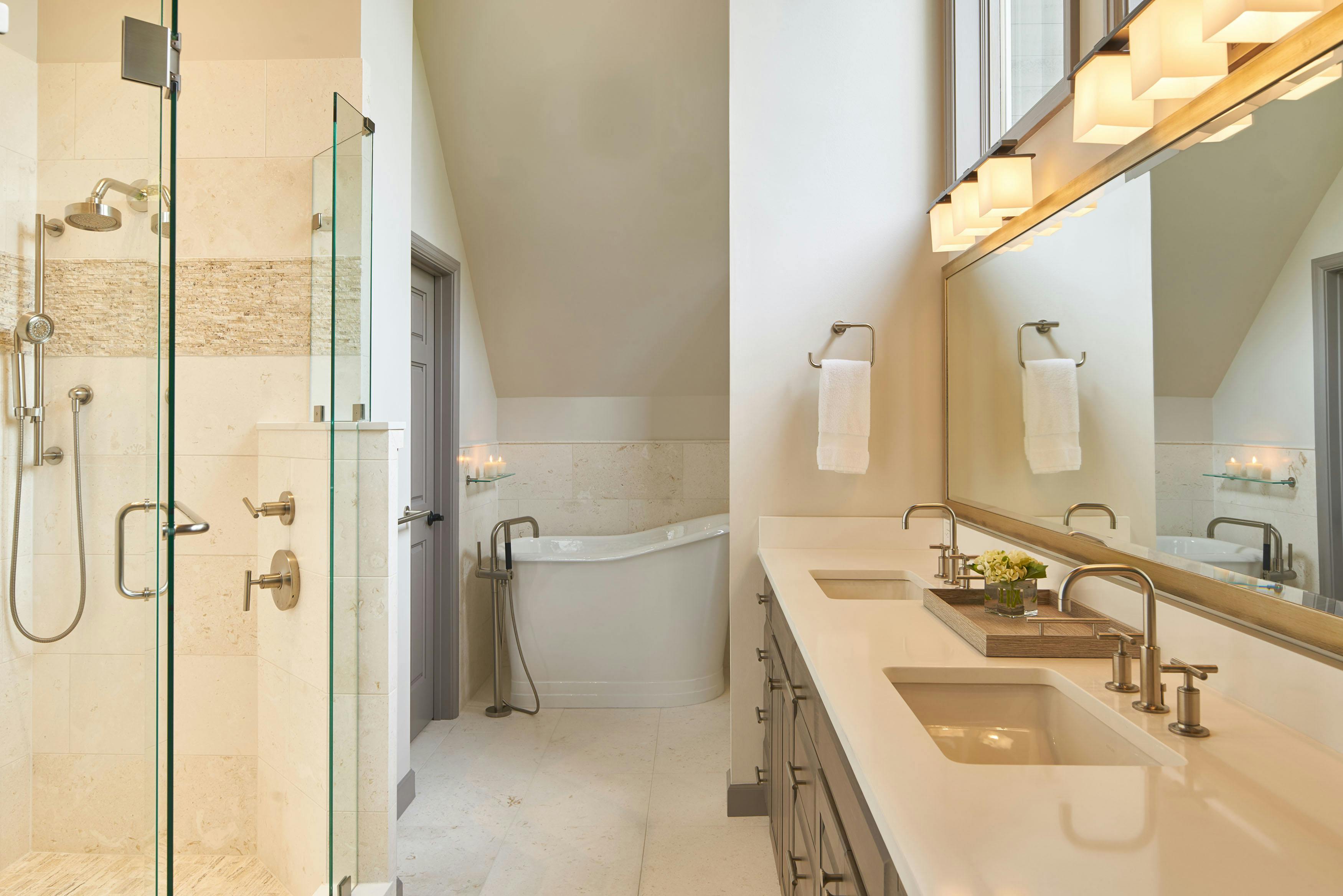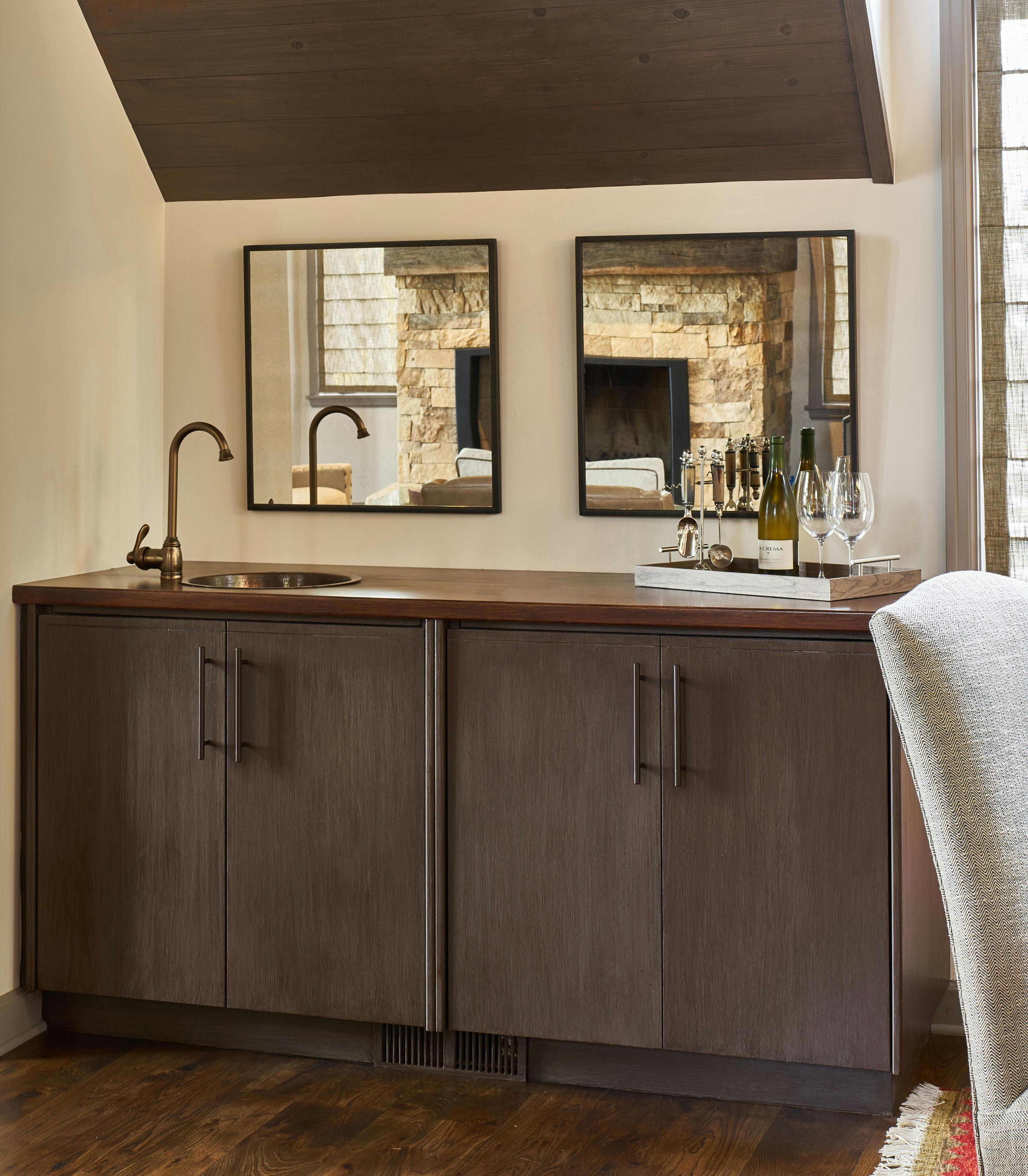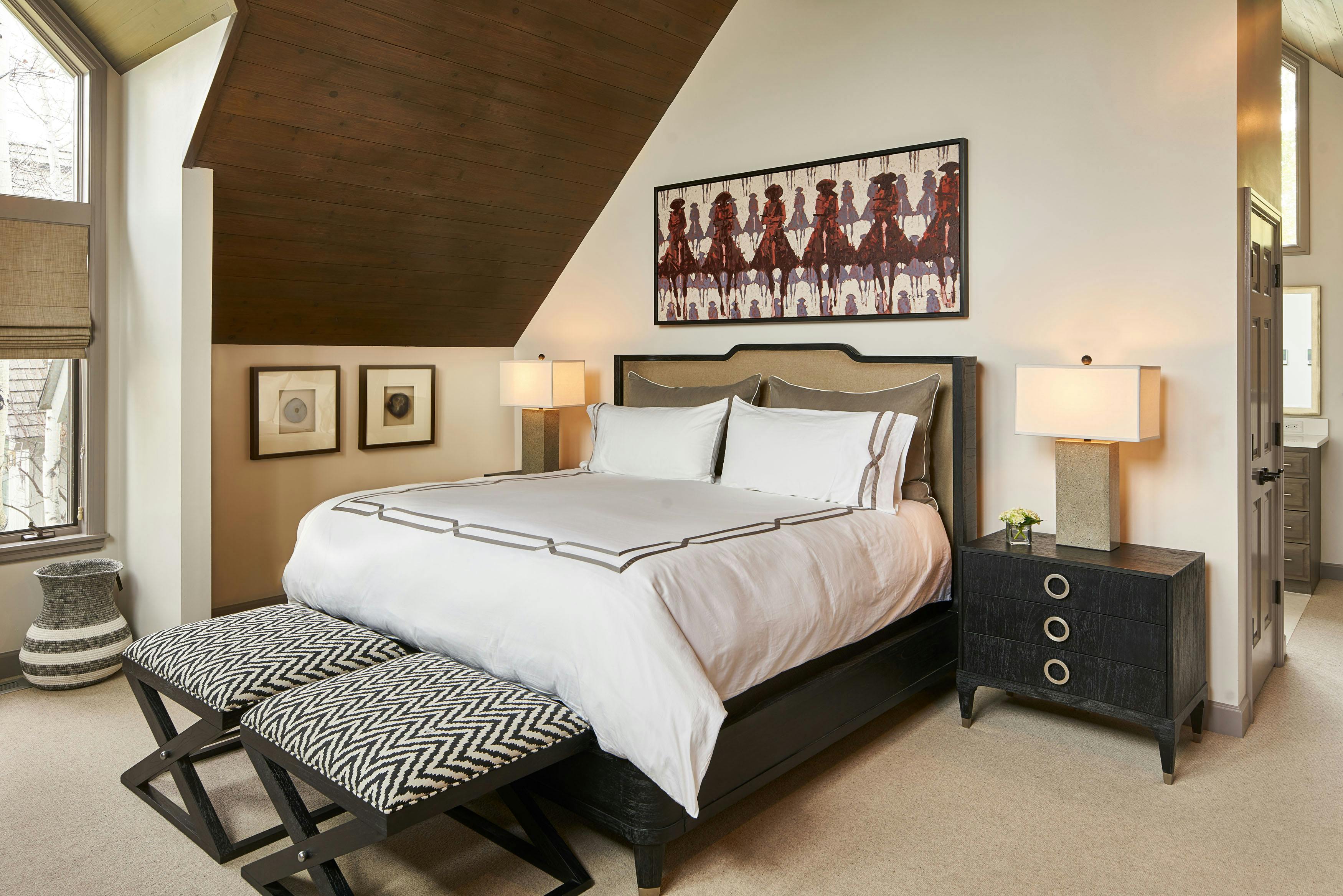 This 4,500 square ft. Teton Pines Cluster Unit was completely remodeled to give this dated residence a completely new transitional mountain feel. The unsightly yellow pine wood was stained either gray or chestnut brown and combined with a crisp fresh paint job made the entire space feel lighter and more open. The custom built-ins, new fireplace, new stair railing, and updated bathrooms helped to redefine the entire residence. The carefully selected furnishings are brought together with the space-defining contemporary western-inspired wool rugs that were sourced from a local rug gallery.